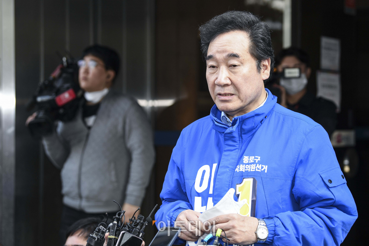 21대 총선에서 서울 종로에 출마하는 이낙연 더불어민주당 후보가 26일 서울 종로구선거관리위원회에서 후보자 등록을 마친 뒤 취재진의 질문에 답하고 있다.