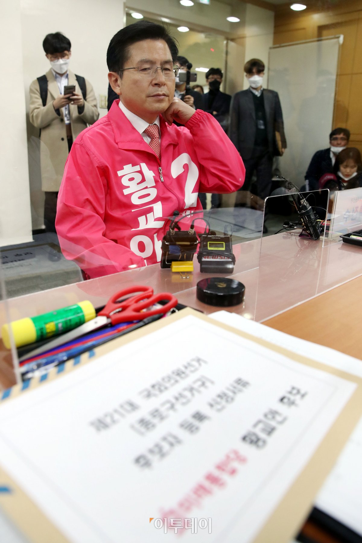 21대 총선에서 서울 종로에 출마하는 황교안 미래통합당 후보가 26일 서울 종로구선거관리위원회에서 후보자 등록을 하고 있다.