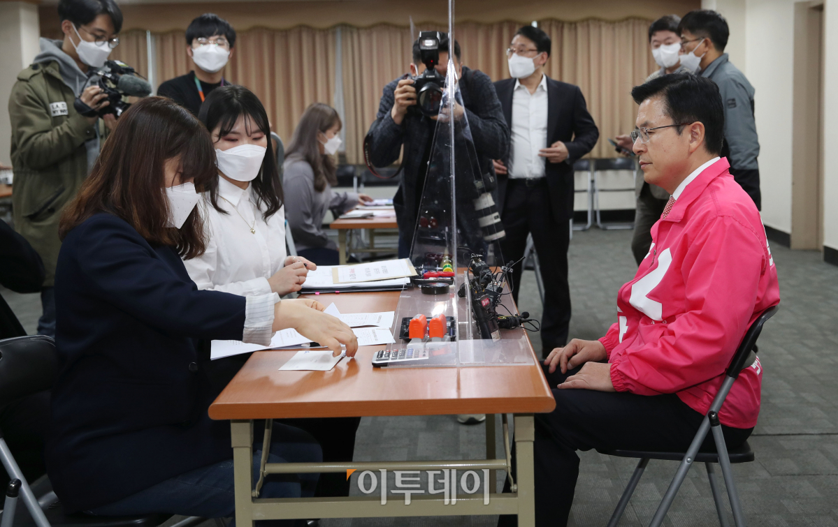 21대 총선에서 서울 종로에 출마하는 황교안 미래통합당 후보가 26일 서울 종로구선거관리위원회에서 후보자 등록을 하고 있다.