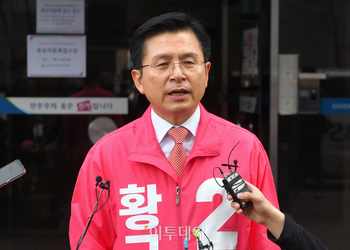 21대 총선에서 서울 종로에 출마하는 황교안 미래통합당 후보가 26일 서울 종로구선거관리위원회에서 후보자 등록을 마친 뒤 취재진의 질문에 답하고 있다.
