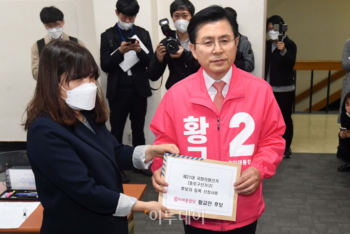 21대 총선에서 서울 종로에 출마하는 황교안 미래통합당 후보가 26일 서울 종로구선거관리위원회에서 후보자 등록을 하고 있다.
