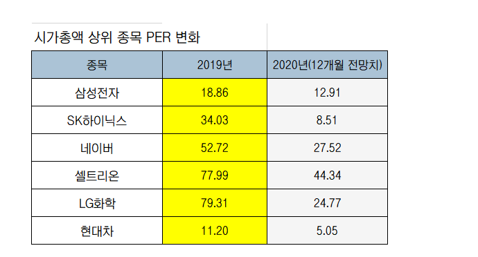 코스피 시가총액 상위 10개 종목들의 PER도 전년과 대비해 모두 하락한 것으로 나타났다. ‘대장주’ 삼성전자는 17.63배에서 9.85배로, SK하이닉스는 34배 수준에서 8.51배로 떨어졌다. 그 이외에도 네이버(52.72배→27.52배), 셀트리온(77.99배→44.03배), LG화학(79.31배→24.77배), 현대차(11.20배→5.20배), LG생활건강(28.71배→23.34배), 삼성SDI(46.59배→19.56배) 등도 내렸다.