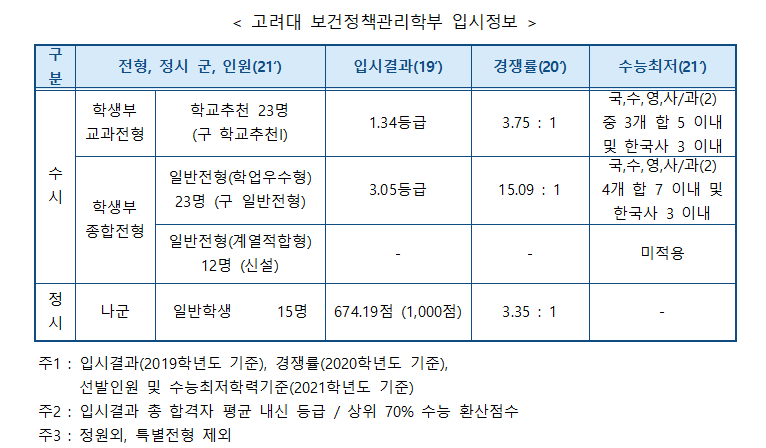 2021학년도 고려대학교 입학전형 시행계획에 의하면 보건정책관리학부는 올해 정원내(고른기회 제외) 73명을 모집합니다. 수시모집 인원이 58명으로 약 79%를 차지하며, 정시모집 인원은 15명으로 약 21% 수준입니다. 전형별로 학생부교과전형(학교추천) 23명, 학생부종합전형(일반전형-학업우수형) 23명, 학생부종합전형(일반전형-계열적합형) 12명, 정시모집에서는 ’나‘군에서 15명을 선발합니다.