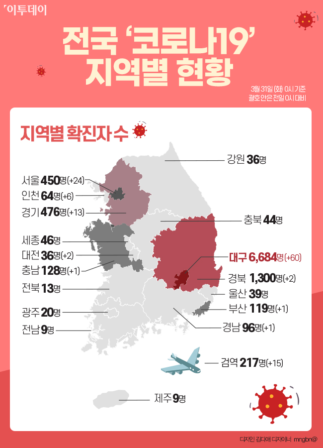 이로써 전국 시·도별 '코로나19' 확진자 수는 △대구 6684명 △경북 1300명으로 가장 많은 비중을 차지했다. 이어 △경기 476명 △서울 450명 △검역소 217명 △충남 128명 △부산 119명 △경남 96명 △인천 64명 △세종 46명 △충북 44명 △울산 39명 △강원 36명 △대전 36명 △광주 20명 △전북 13명 △전남과 제주가 각 9명 순으로 나타났다.