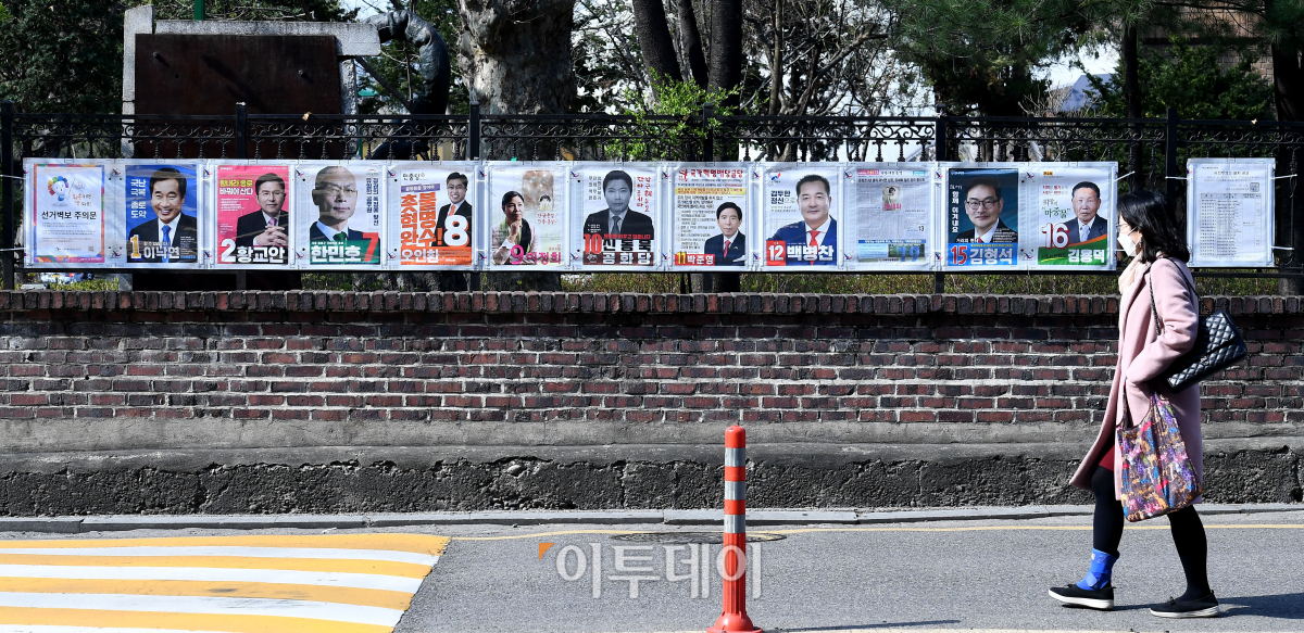 제21대 국회의원선거 선거운동이 시작된 2일 서울 종로구 대학로의 한 거리에 종로구 국회의원 후보자 선거벽보가 게시돼 있다.