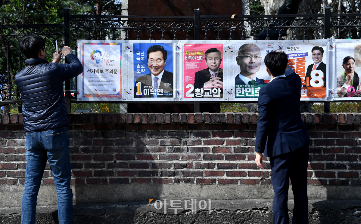 제21대 국회의원선거 선거운동이 시작된 2일 서울 종로구 대학로의 한 거리에서 서울시선관위 관계자들이 종로구 국회의원 후보자 선거벽보를 부착하고 있다.