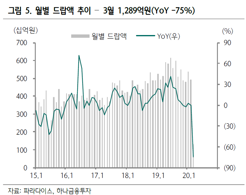 그는 “4월부터 입국 외국인의 경우 2주간 자가격리 조치가 이뤄지고 있는데, 하루의 게임을 즐기기 위해선 15일간의 한국 방문 일정이 필요하다”며 “변동사항이 없다면 4~5월 드랍액은 -90% 이하의 어려운 영업환경이 예상된다”고 설명했다.