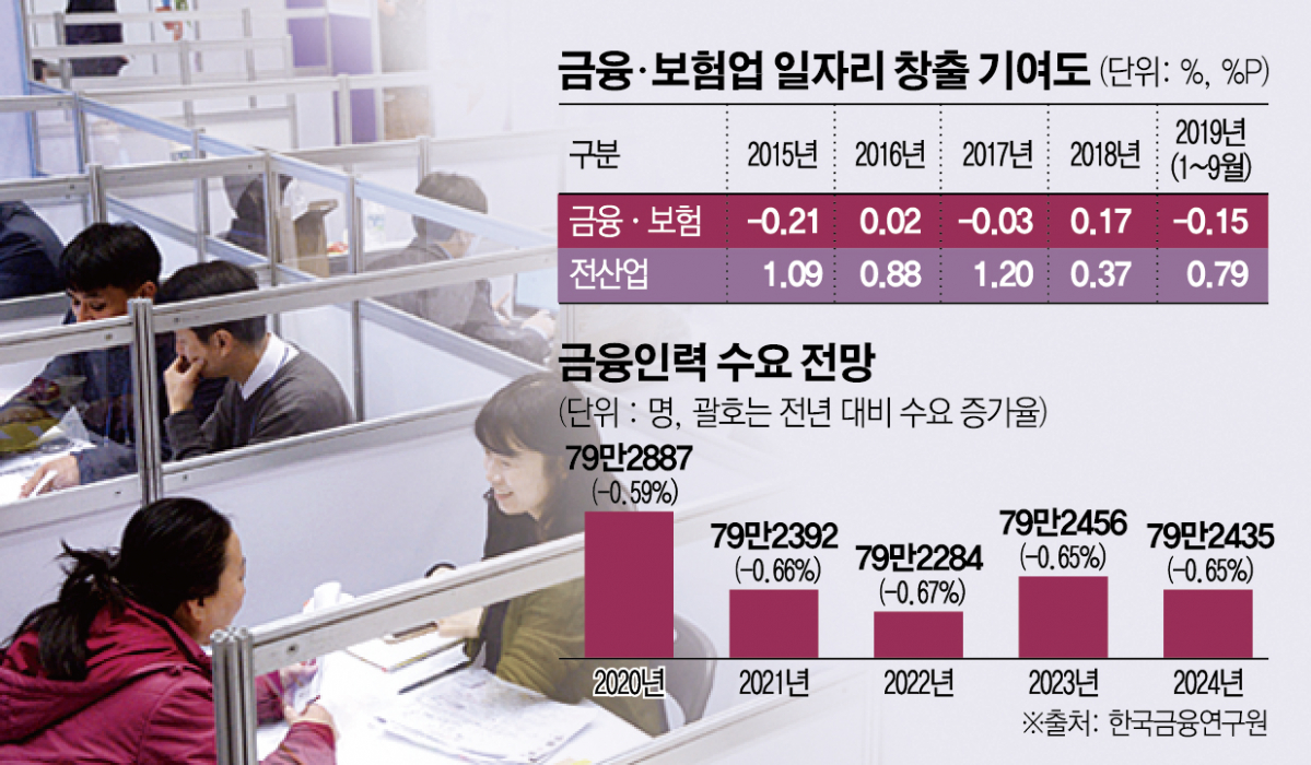 지난해 금융권 일자리 창출 기여도가 '낙제점'을 받았다. 산업구조 개편과 대규모 퇴직 등이 맞물려 앞으로 5년간 매년 금융권 일자리가 5000개씩 줄 거라는 전망이 나오고 있다.