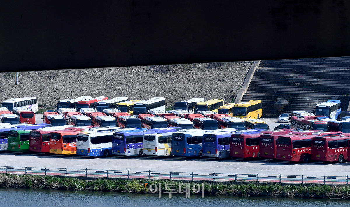 신종 코로나바이러스 감염증(코로나19) 사태가 장기화되며 관광업계의 시름이 깊어지고 있다. 5일 서울 송파구 탄천공영주차장에 봄철 성수기 주말임에도 영업을 나가지 못한 관광버스들이 주차돼 있다. 정부는 이날까지 시행하기로 예정했던 ‘고강도 사회적 거리두기’를 19일까지 연장하기로 했다.