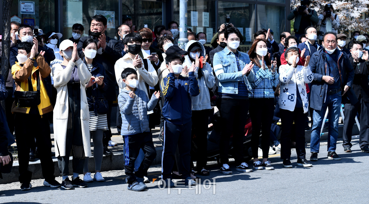 5일 서울 종로구 무악동의 한 거리에서 시민들이 21대 총선에서 종로에 출마한 이낙연 더불어민주당 후보의 발언을 듣고 있다.
