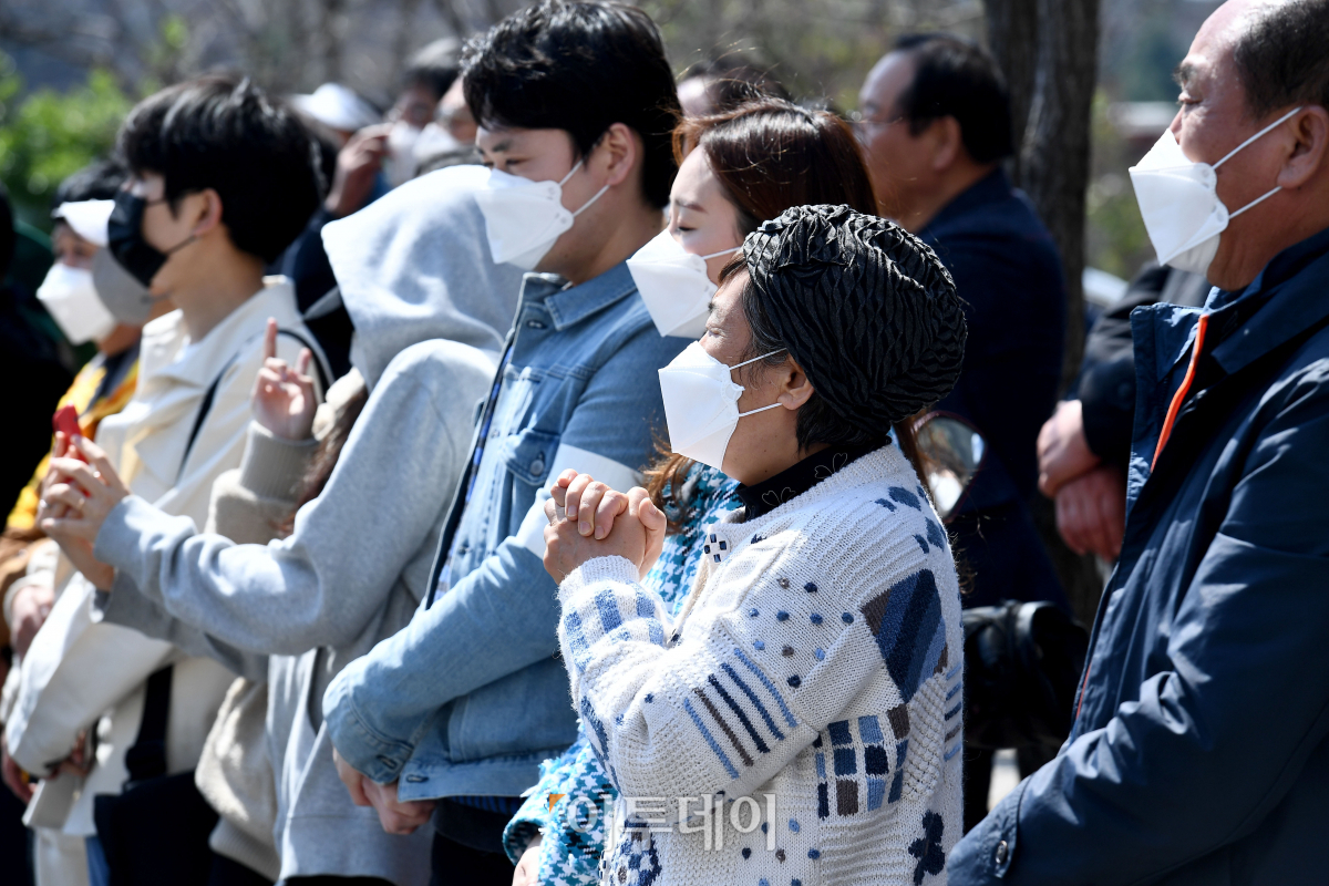 5일 서울 종로구 무악동의 한 거리에서 시민들이 21대 총선에서 종로에 출마한 이낙연 더불어민주당 후보의 발언을 듣고 있다.
