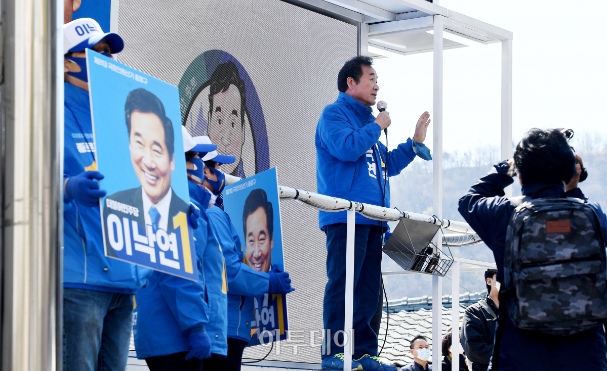 21대 총선에서 서울 종로에 출마한 이낙연 더불어민주당 후보가 5일 서울 종로구 무악동의 한 거리에서 유세차량에 올라 시민들에게 지지를 호소하고 있다.
