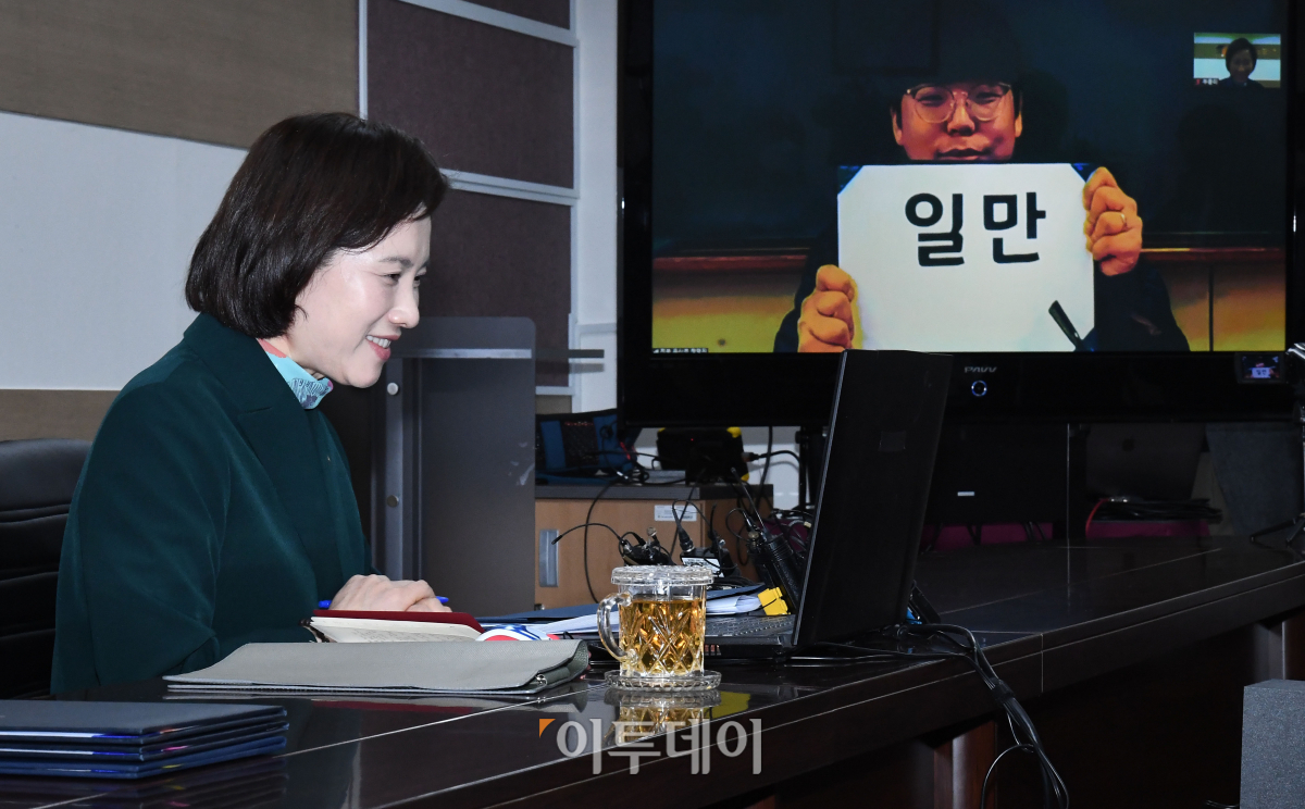 고3·중3의 온라인 개학이 사흘 앞으로 다가온 가운데 유은혜 부총리 겸 교육부 장관이 6일 서울 여의도 교육시설공제회관에서 열린 ‘1만 커뮤니티’ 온라인 임명식에서 대표 교사의 발언을 듣고 있다. 현장 교사의 원격수업을 지원하기 위한 ‘1만 커뮤니티’는 전국 17개 시도의 학교별 대표 교사와 교육부·교육청·한국교육학술정보원 등 유관 기관 관계자가 모인 온라인 커뮤니티다.