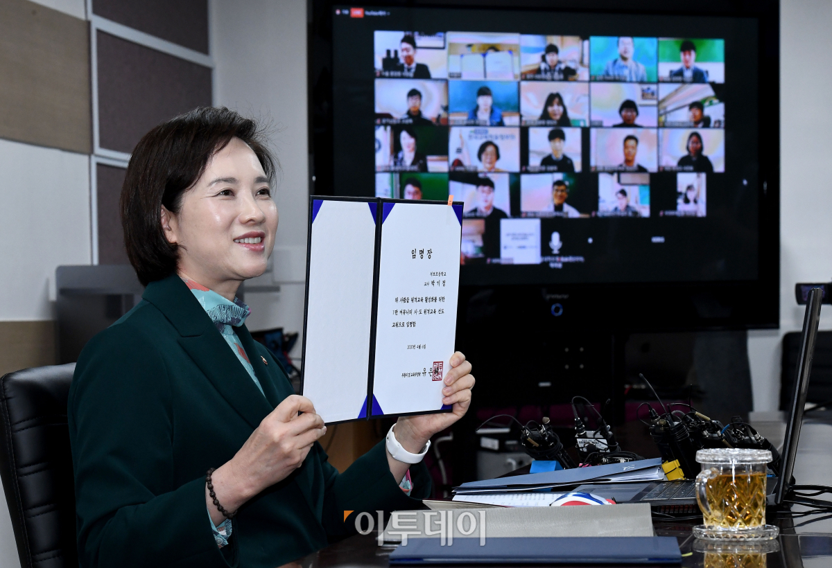 고3·중3의 온라인 개학이 사흘 앞으로 다가온 가운데 유은혜 부총리 겸 교육부 장관이 6일 서울 여의도 교육시설공제회관에서 열린 ‘1만 커뮤니티’ 온라인 임명식에서 대표 교사들에게 임명장을 수여하고 있다. 현장 교사의 원격수업을 지원하기 위한 ‘1만 커뮤니티’는 전국 17개 시도의 학교별 대표 교사와 교육부·교육청·한국교육학술정보원 등 유관 기관 관계자가 모인 온라인 커뮤니티다.