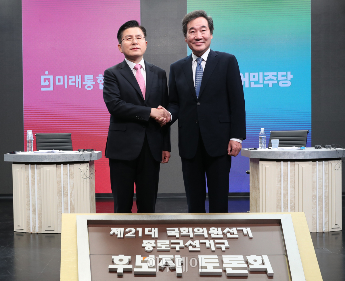 4·15 총선에서 서울 종로구에 출마한 더불어민주당 이낙연 공동 상임선대위원장(오른쪽)과 미래통합당 황교안 대표가 6일 오전 서울 강서구 티브로드방송 강서제작센터에서 열린 종로구 선거방송토론위원회 주최 토론회에서 만나 악수하고 있다. 국회사진취재단