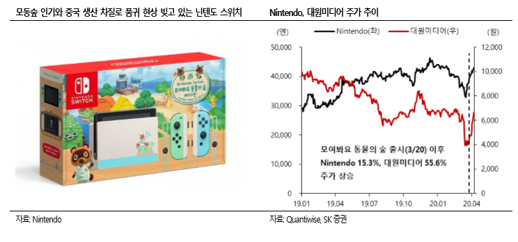 그는 “대원미디어는 2017년부터 국내 닌텐도 게임기 유통을 약 50%가량 담당하고 있어 M/S 1위”라며 “닌텐도 게임기 유통이 전체 매출의 50% 이상 차지하고 있어, 동물의 숲 흥행에 주가도 반등했다. 다만 반등 수준 고려하면 연초 수준에 못 미쳐 판매 실적 확인 시까지 모멘텀 지속이 가능하다”고 전망했다.