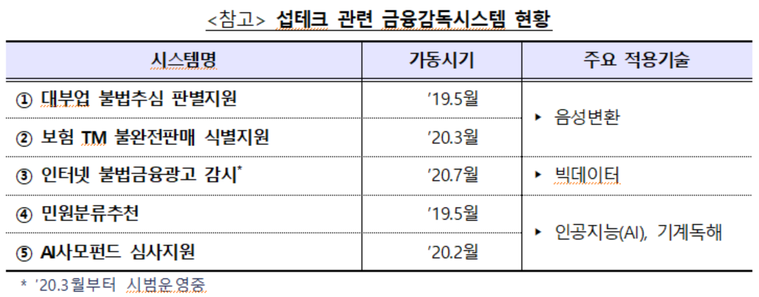 지난해 대부업 불법추심 판별지원 및 민원분류 추천시스템 운영을 시작으로 최근 AI 사모펀드 심사, 보험TM 불완전판매 식별, 인터넷 불법금융광고 감시 등 5개의 시스템으로 확대 구축해 운영중에 있다.