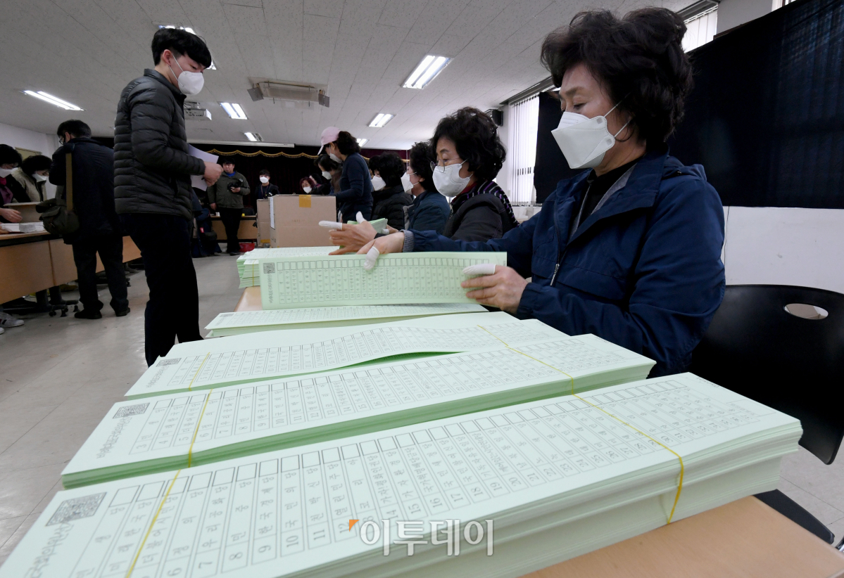 7일 서울 영등포구선관위에서 관계자들이 제21대 국회의원선거 투표지를 검수하고 있다.