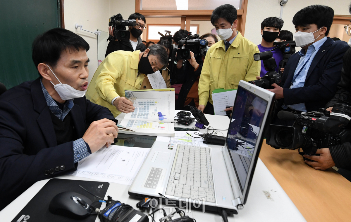 박백범 교육부차관(왼쪽 두번째)이 8일 서울 종로에 위치한 시각장애 특수학교인 서울맹학교를 방문, 코로나19로 인한 원격수업 현장을 살펴보고 있다.