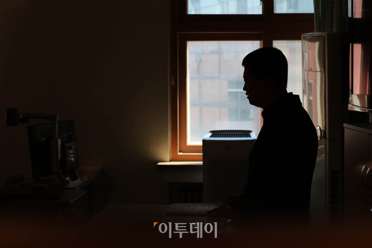 코로나19 영향으로 실시되는 `온라인 개학'을 하루 앞둔 8일 오후 서울 종로구 신교동 국립서울맹학교에서 통합과학 과목을 담당하는 박동해 선생이 불을 끈 교실에서 학생들과 이야기를 나누고 있다. 박 교사는 시각장애인으로 불을 끄고 수업을 진행했다.