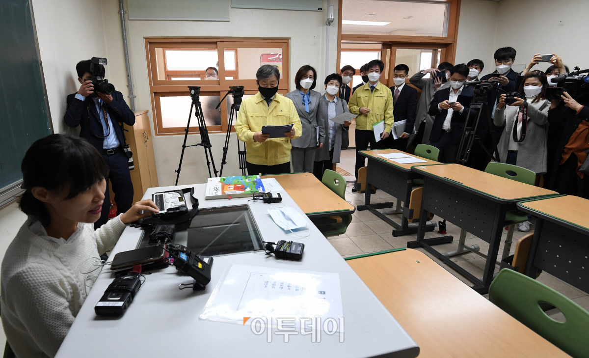 박백범 교육부차관(왼쪽 세번째)이 8일 서울 종로에 위치한 시각장애 특수학교인 서울맹학교를 방문, 코로나19로 인한 원격수업 현장을 살펴보고 있다.