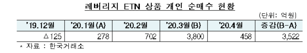 실제 레버리지 ETN 상품의 월간 개인 순매수 금액은 지난 1월 278억 원에서 3월 3800억 원으로 3522억 원(1266.9%) 증가했다.