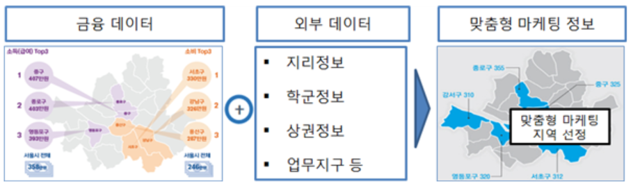소비자 성향, 지역, 시기 등에 특화한 맞춤형 서비스·마케팅, 복지서비스 등을 할 수 있고, 지역별 소득, 소비, 저축, 여신 등 정보가 공공기관, 유통회사 등에 제공되면 더 정교하게 상권 분석도 할 수 있다.