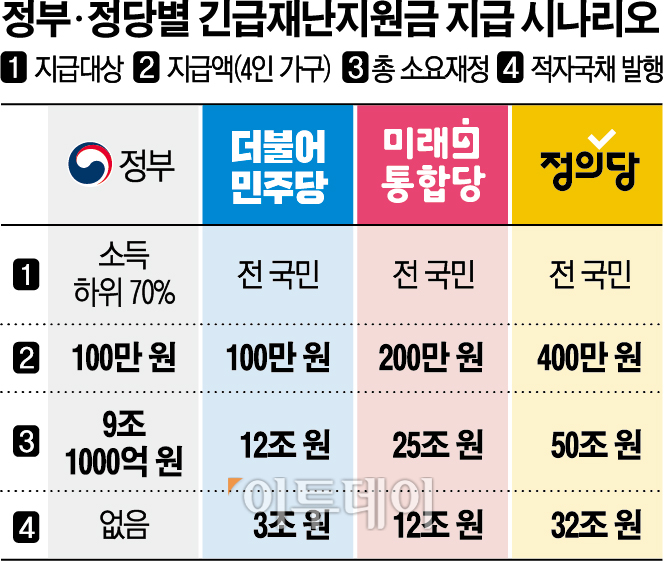 재정 부담을 키우지 않으면서 지급대상을 확대하려면 지급액을 조정할 수밖에 없다. 더불어민주당과 미래통합당은 지급대상을 100%로 확대하되, 각각 지급액을 4인 가구 기준으로 100만 원으로 유지하는 안과 200만 원으로 확대하는 안을 내놓은 상태다. 이 경우 소요재정은 각각 13조 원, 25조 원으로 불어나게 된다. 국비·지방비 비율을 유지한다고 가정했을 때 3조~12조 원의 적자국채 발행이 필요하다.