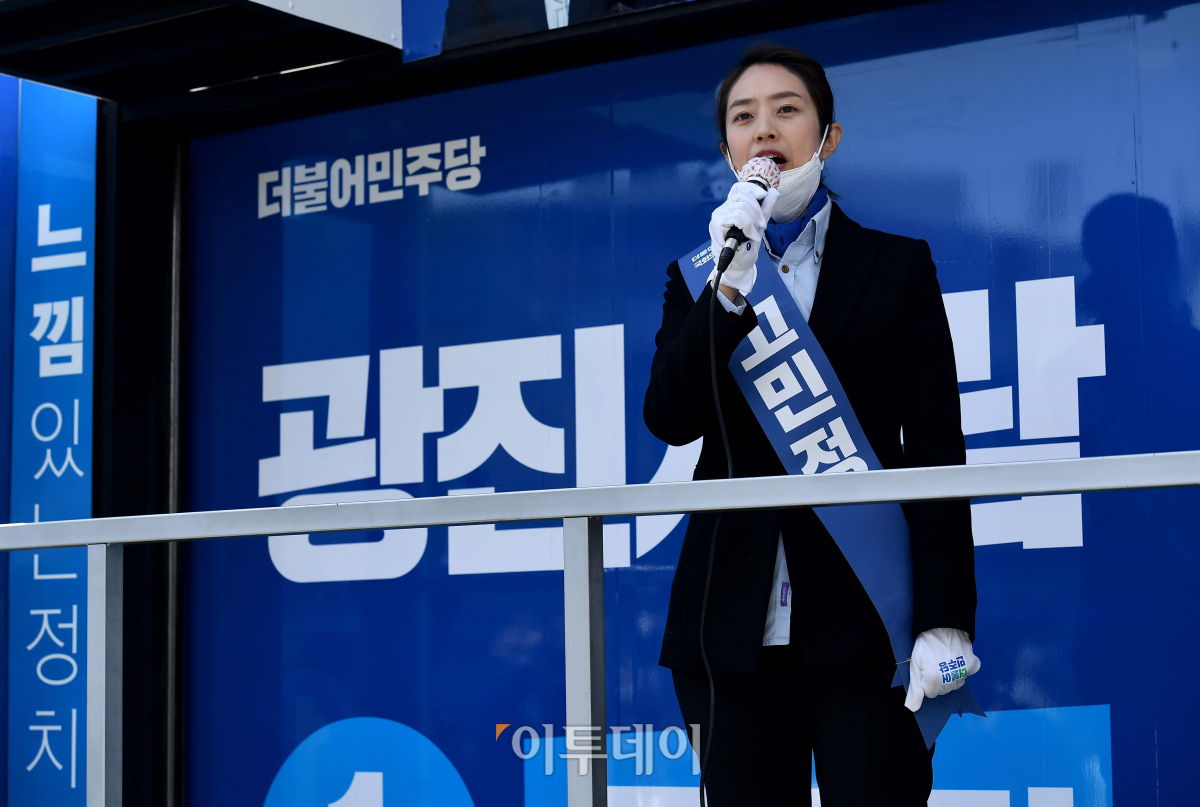 21대 총선에서 서울 광진을에 출마한 고민정 더불어민주당 후보가 13일 서울 광진구 자양동의 한 거리에서 유세차량에 올라 시민들에게 지지를 호소하고 있다.