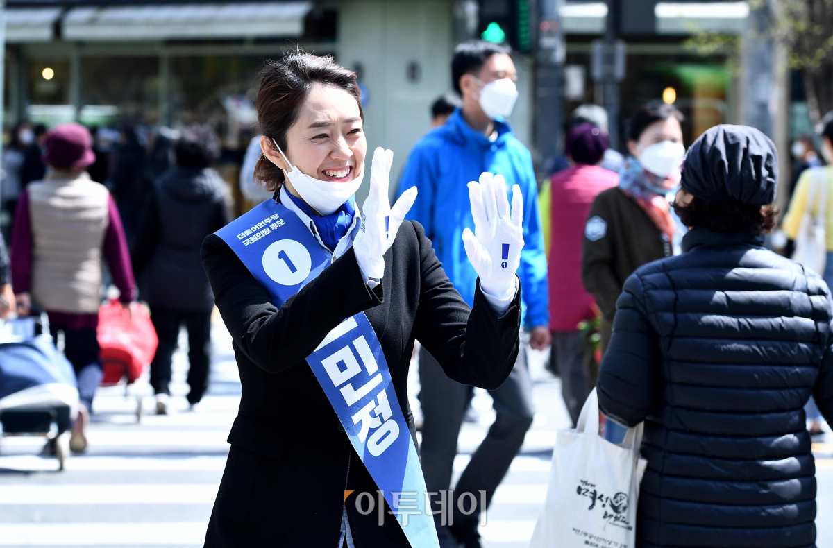 21대 총선에서 서울 광진을에 출마한 고민정 더불어민주당 후보가 13일 서울 광진구 자양동의 한 거리에서 시민들에게 지지를 호소하고 있다.