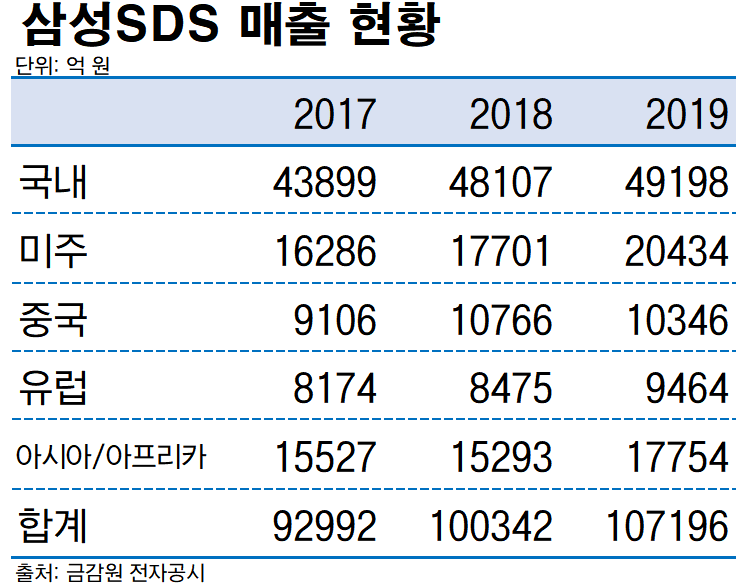 삼성SDS의 매출 판도에 변화가 일고 있다. 지난해 미주 지역에서만 2조 원 넘는 매출을 올리는 등 해외에서 강세를 보이면서 국내 비중은 45%대로 떨어진 것으로 나타났다.