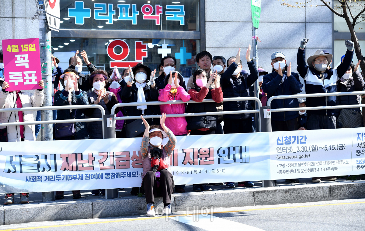 13일 서울 동작구 상도동의 한 거리에서 시민들이 21대 총선 동작을에 출마한 나경원 미래통합당 후보의 발언을 듣고 있다.