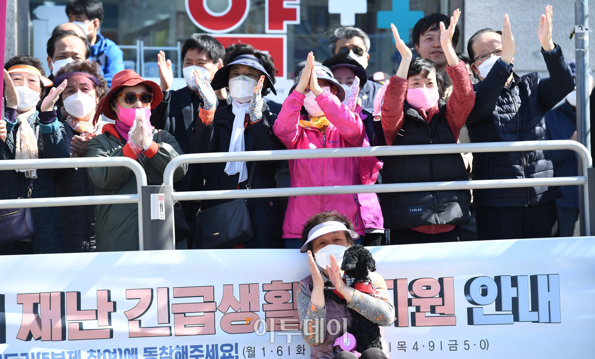 13일 서울 동작구 상도동의 한 거리에서 시민들이 21대 총선 동작을에 출마한 나경원 미래통합당 후보의 발언을 듣고 있다.