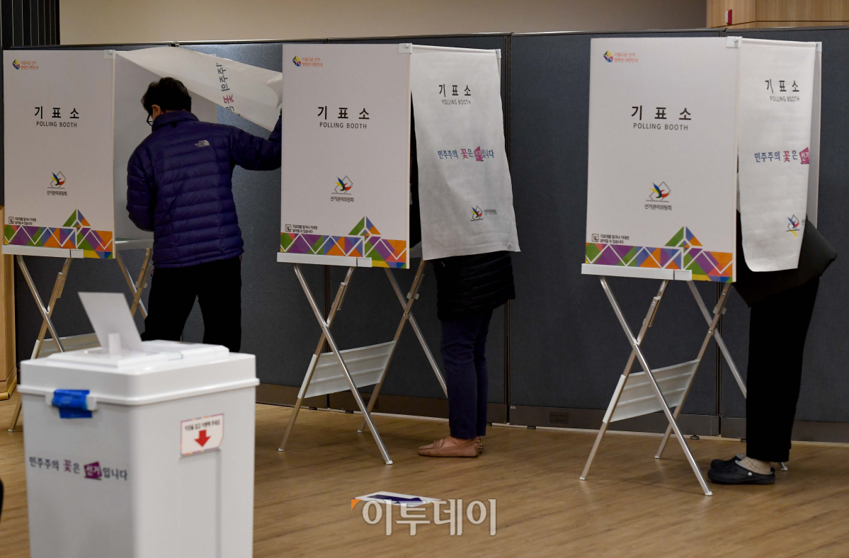 제21대 국회의원 선거일인 15일 서울 종로구 교남동 제3투표소에서 시민들이 투표를 하고 있다.