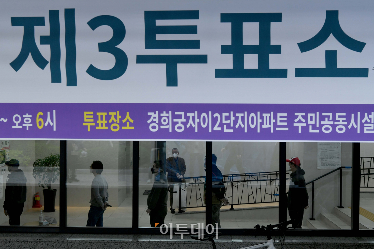 제21대 국회의원 선거일인 15일 서울 종로구 교남동 제3투표소에서 시민들이 투표를 위해 줄지어 서있다.