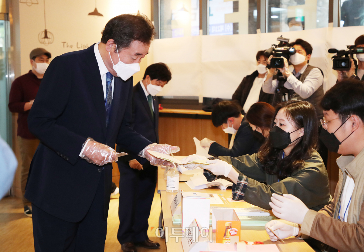 제21대 국회의원선거에서 종로에 출마한 이낙연 더불어민주당 후보가 15일 서울 종로구 교남동 제3투표소에서 투표를 하고 있다.