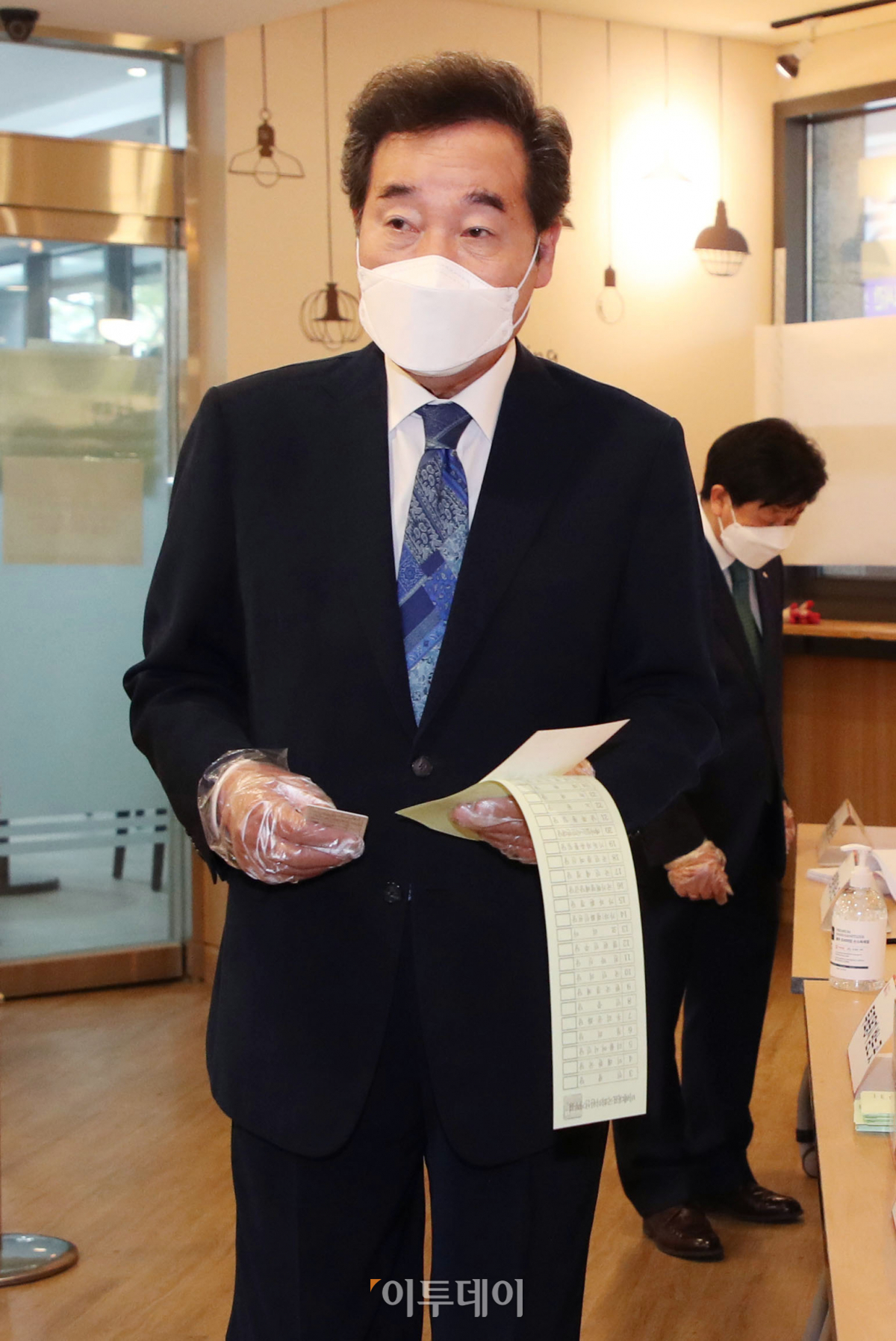 제21대 국회의원선거에서 종로에 출마한 이낙연 더불어민주당 후보가 15일 서울 종로구 교남동 제3투표소에서 투표를 하고 있다.