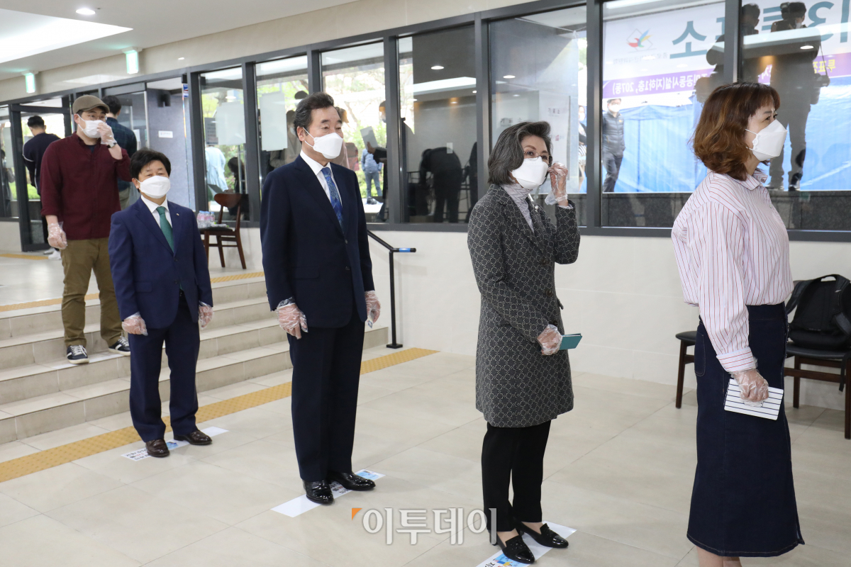제21대 국회의원선거에서 종로에 출마한 이낙연 더불어민주당 후보와 배우자 김숙희씨가 15일 서울 종로구 교남동 제3투표소에서 투표를 하기 위해 줄 서 있다.