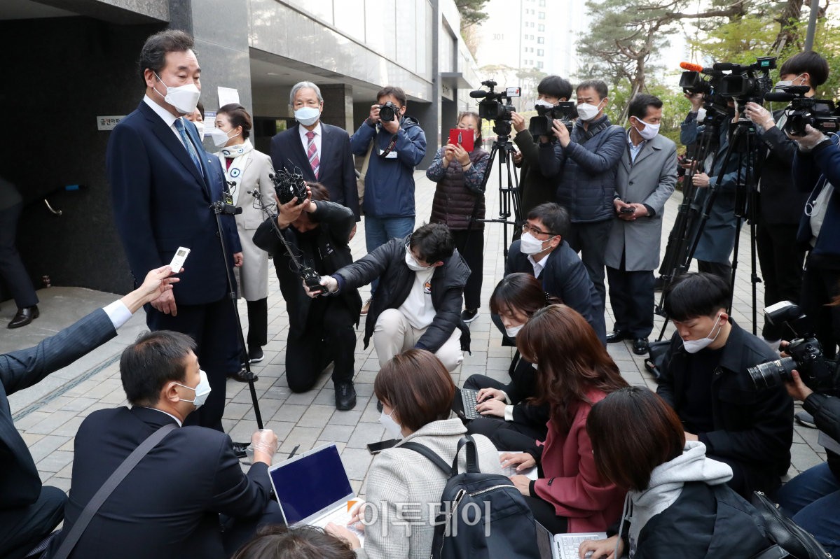 제21대 국회의원선거에서 종로에 출마한 이낙연 더불어민주당 후보가 15일 서울 종로구 교남동 제3투표소에서 투표를 마친 뒤 취재진의 질문에 답하고 있다.