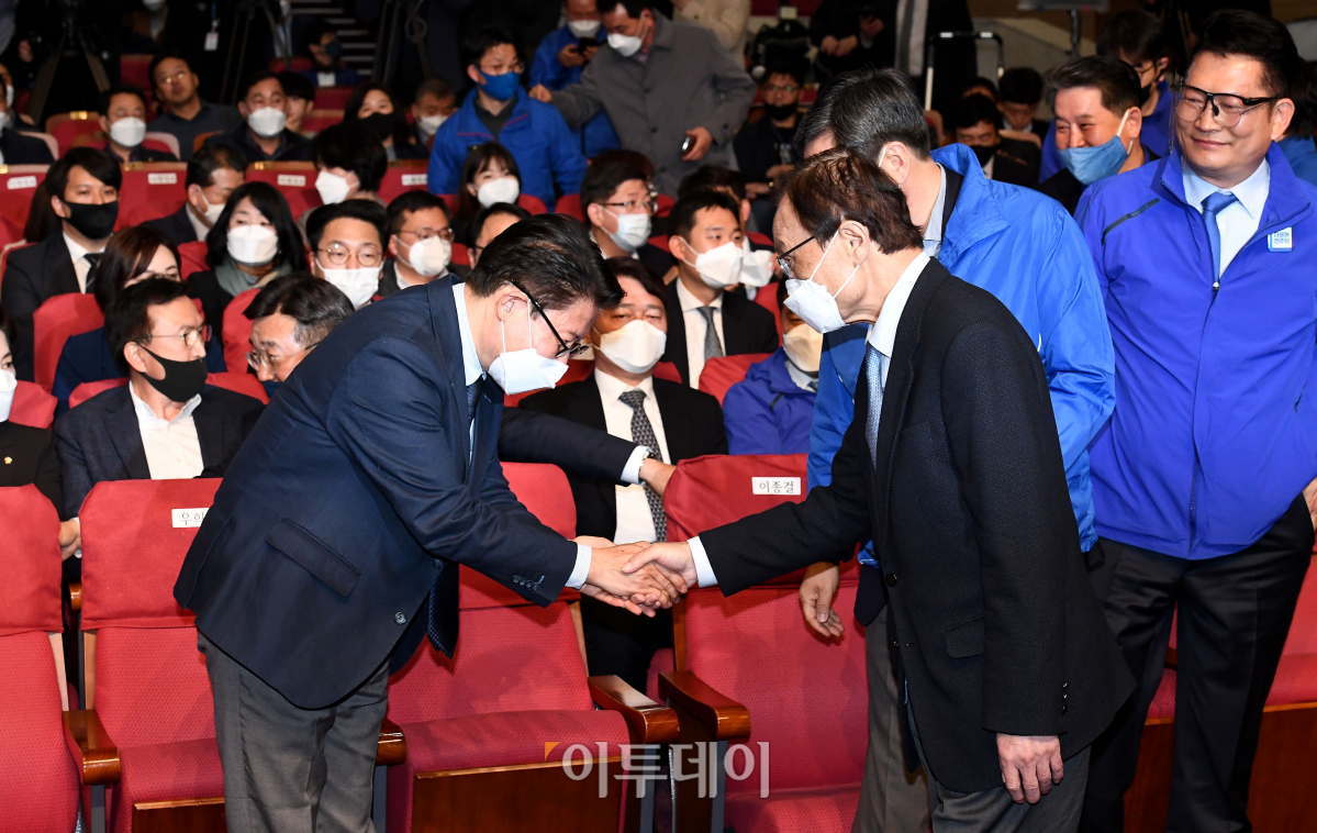 제21대 국회의원 선거일인 15일 서울 여의도 국회 의원회관 더불어민주당 개표상황실에서 이해찬(오른쪽) 민주당 대표와 우희종 더불어시민당 상임공동선거대책위원장이 악수하고 있다.
