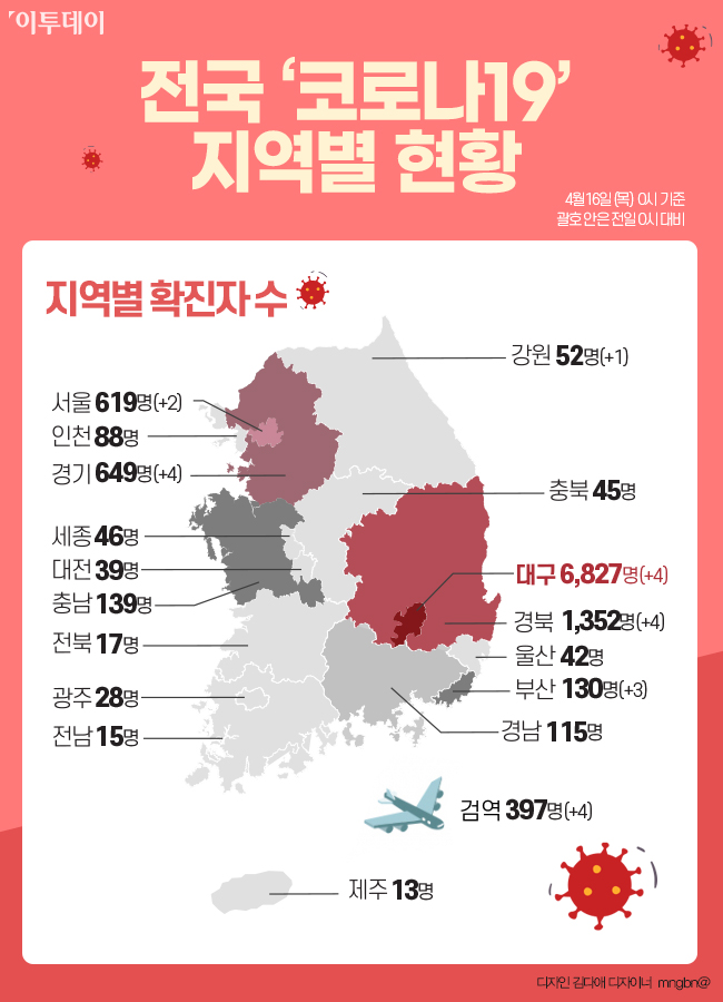 이로써 전국 시·도별 '코로나19' 확진자 수는 △대구 6827명 △경북 1352명으로 가장 많은 비중을 차지했다. 이어 △경기 649명 △서울 619명 △검역소 397명 △충남 139명 △부산 130명 △경남 115명 △인천 88명 △강원 52명 △세종 46명 △충북 45명 △울산 42명 △대전 39명 △광주 28명 △전북 17명 △전남 15명 △제주 13명 순으로 나타났다.