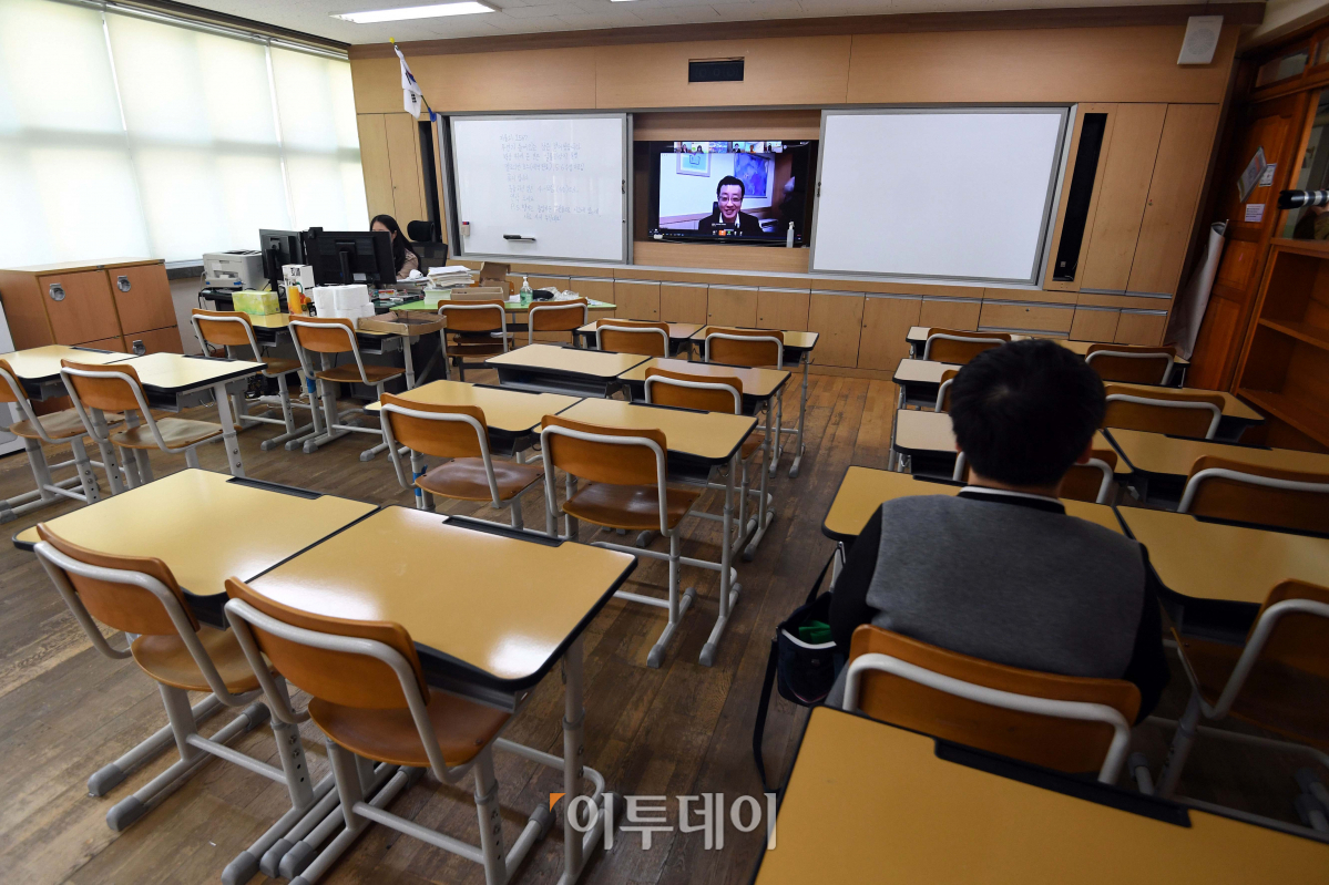 전국 초등학교 4,5,6학년과 중·고등학교 1,2학년이 2차 온라인 개학을 한 16일 서울 용산초에서 돌봄교실을 신청한 학생이 홀로 앉아 화상으로 온라인 개학식에 참여하고 있다. 지난 9일 전국 고3, 중3 학생들이 1차 온라인 개학을 한 데 이어 일주일 만으로 2차 온라인 개학 해당 학년은 이날부터 수업과 출·결석 확인, 일부 평가를 모두 원격수업으로 진행한다.