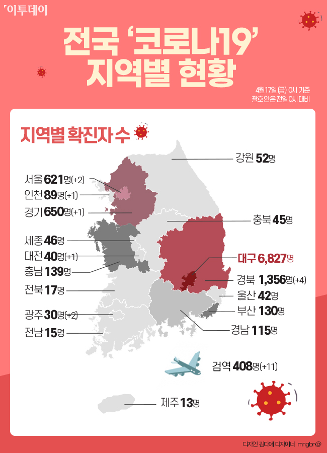전국 시·도별 '코로나19' 확진자 수는 △대구 6827명 △경북 1356명으로 가장 많은 비중을 차지했다. 이어 △경기 650명 △서울 621명 △검역소 408명 △충남 139명 △부산 130명 △경남 115명 △인천 89명 △강원 52명 △세종 46명 △충북 45명 △울산 42명 △대전 40명 △광주 30명 △전북 17명 △전남 15명 △제주 13명 순으로 나타났다.