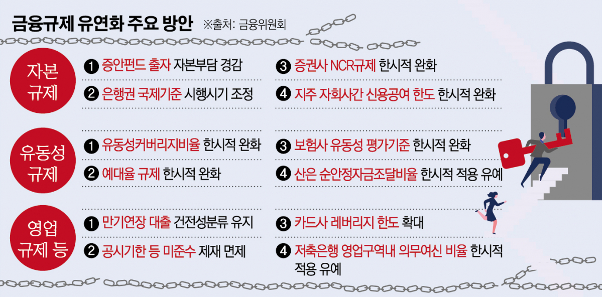 ◇ 펀드출자 부담 없도록 위험가중치 축소 = 이번 방안은 코로나19로 어려움을 겪는 실물경제에 자금을 원활히 공급할 수 있도록 금융규제 유연화 필요성이 제기된 데 따른 것이다. 금융위는 크게 ‘자본 규제’, ‘유동성 규제’, ‘영업 규제’로 분류해 규제의 한시적 완화 및 제재 면제 등의 내용을 발표했다.