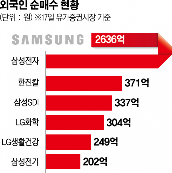 특히 이날 외국인 매수세는 시총 상위 대형 IT주에 몰렸다. 외국인은 삼성전자 2636억 원, 삼성전기 202억 원, 삼성SDI 337억 원, 삼성전자우 171억 원을 순매수했다.