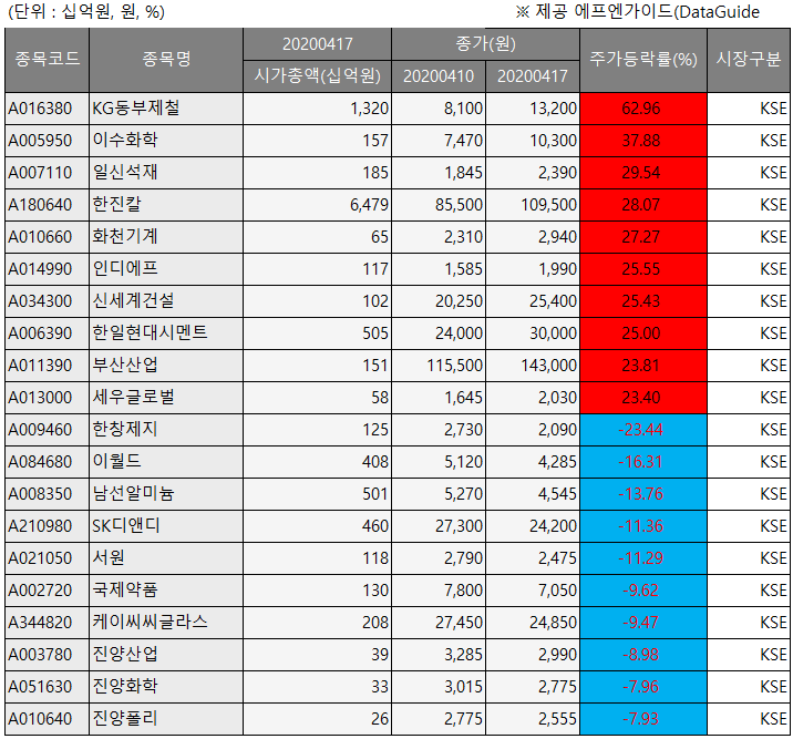 지난주는 남북경협주의 강세도 보였다 일신석재, 인디에프가 대표적이며 각각 29.54%(3위), 25.55%(6위) 상승률을 보였다. 더불어민주당이 15일 총선 압승으로 남북 관계 회복에 탄력을 받을 것이라는 전망이다.