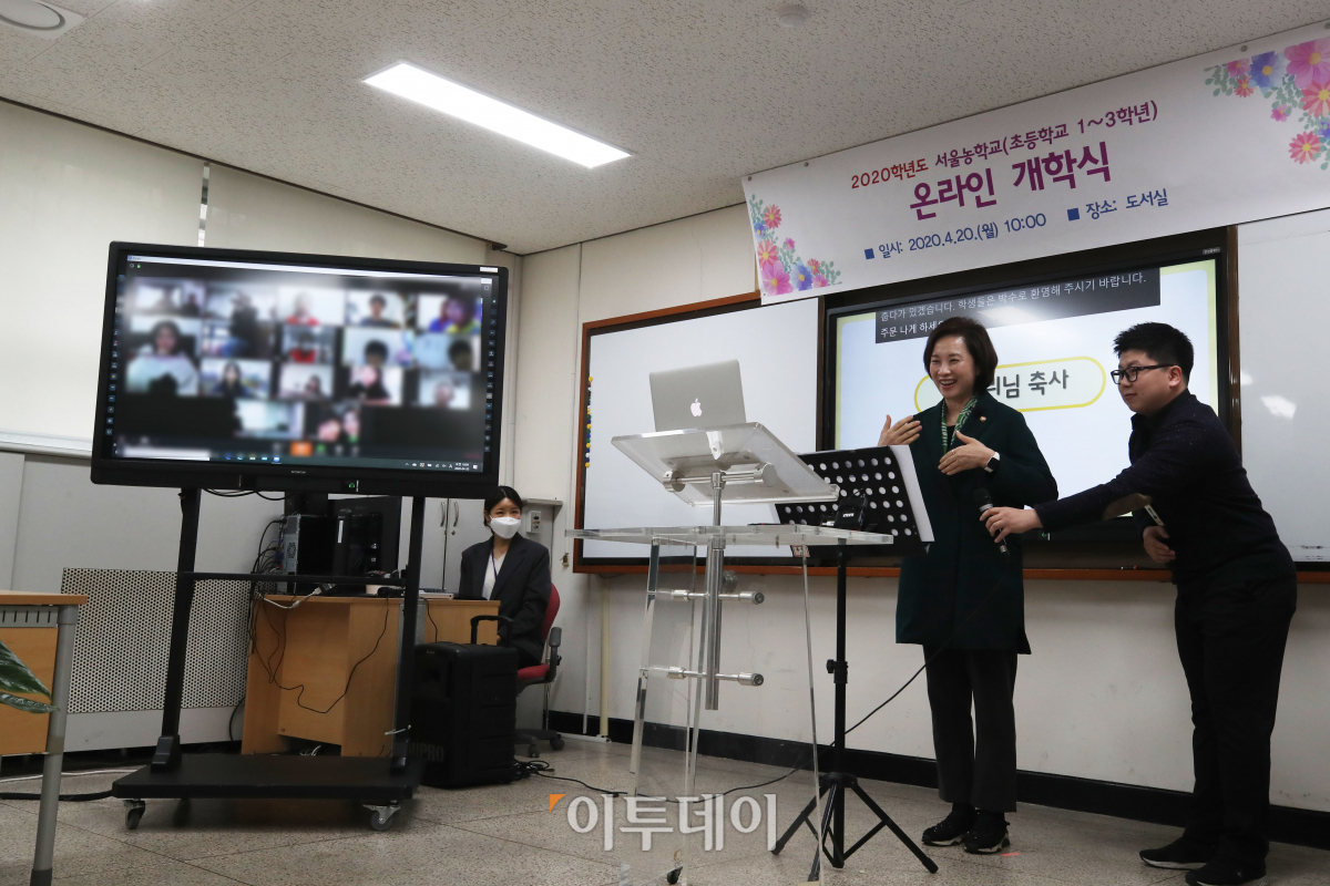 전국 초등학교 1,2,3학년의 개학으로 3차에 걸친 온라인 개학이 마무리된 20일 서울 종로구 국립서울농학교에서 유은혜 부총리 겸 교육부장관이 화상으로 개학식 축사를 하고 있다. 이날 개학 대상자는 모두 146만여 명으로 앞서 온라인 개학을 한 초·중·고교생까지 모두 540만 명이 온라인으로나마 등교하게 됐다. 이 중 초등학교 1·2학년은 스마트 기기를 통한 수업이 어려워 EBS TV 방송과 학습꾸러미를 통해 원격수업을 진행한다.
