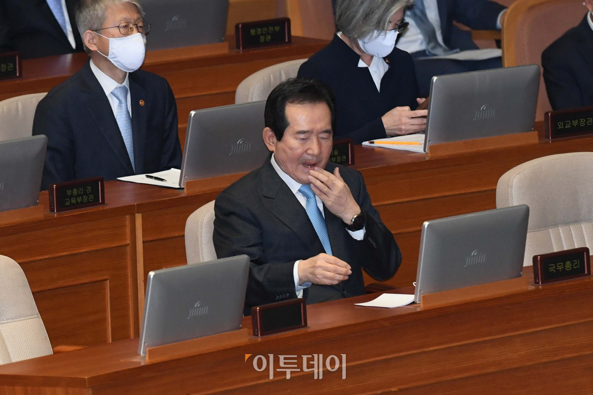 정세균 국무총리가 20일 서울 여의도 국회에서 열린 본회의에서 신종 코로나바이러스 감염증(코로나19) 사태 긴급재난지원금 지급을 위한 추가경정예산(추경)안 편성과 관련한 시정연설에 앞서 얼굴을 만지고 있다.