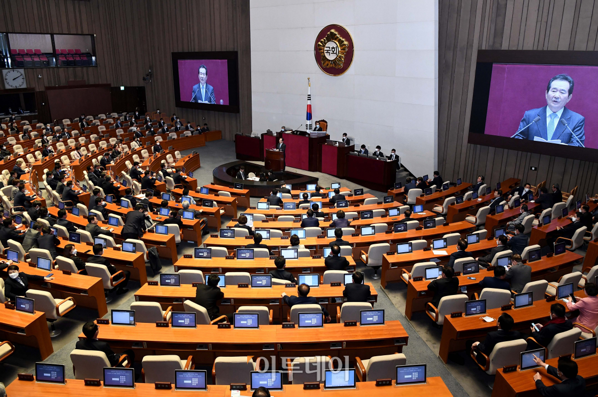 정세균 국무총리가 20일 서울 여의도 국회에서 열린 본회의에서 신종 코로나바이러스 감염증(코로나19) 사태 긴급재난지원금 지급을 위한 추가경정예산(추경)안 편성과 관련한 시정연설을 하고 있다.