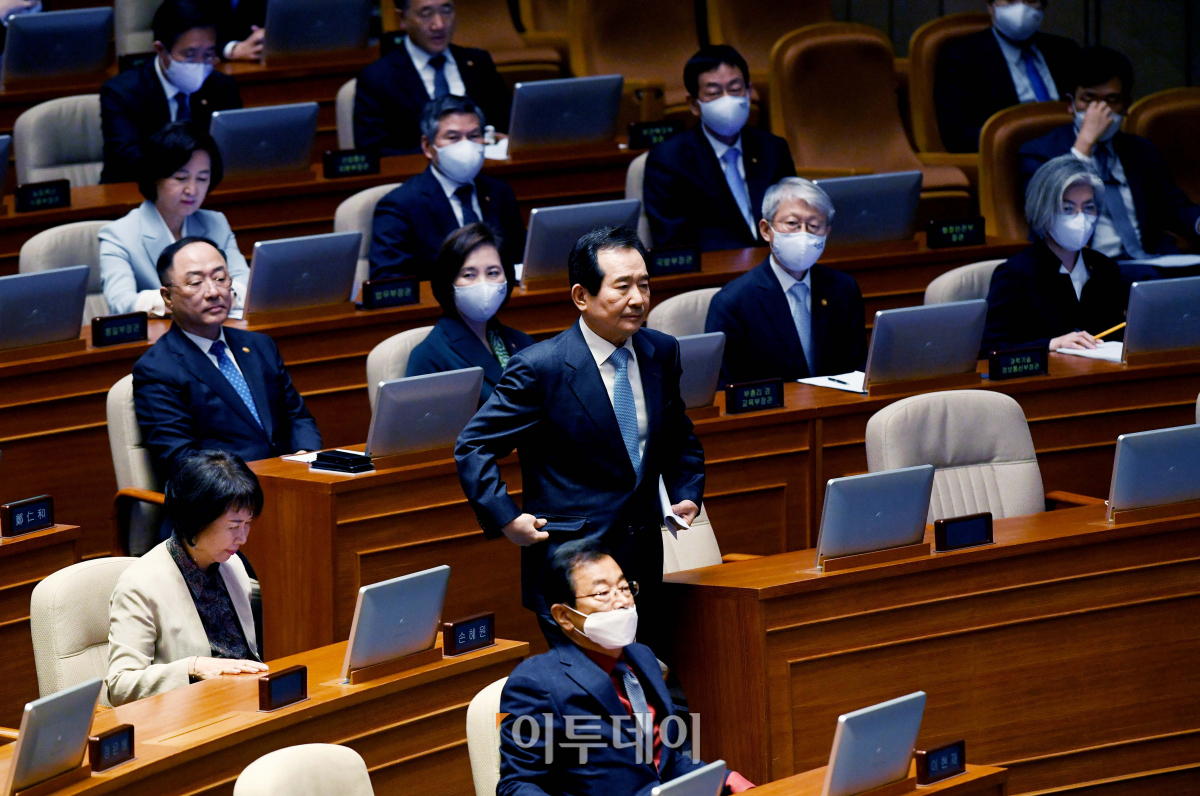 정세균 국무총리가 20일 서울 여의도 국회에서 열린 본회의에서 신종 코로나바이러스 감염증(코로나19) 사태 긴급재난지원금 지급을 위한 추가경정예산(추경)안 편성과 관련한 시정연설을 하기 위해 발언대로 향하고 있다.